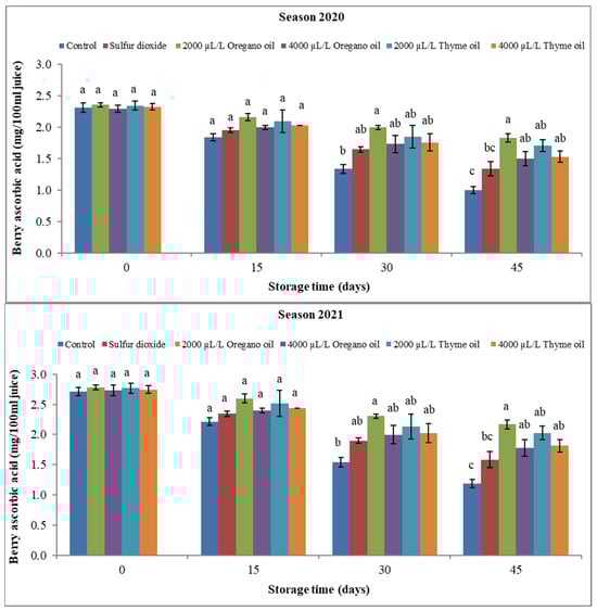 Effect of preharvest applications of oregano and thyme EOs on the berry ascorbic acid content of ‘Flame Seedless’ grapes during cold storage at 1 °C. Each value represents the mean ± SE of three replicates. Means followed by the same letters in each season and storage period are not significantly different according to Tukey’s HSD test at p ≤ 0.05.