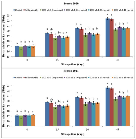 Effect of preharvest applications of oregano and thyme EOs on the berry soluble solids content of ‘Flame Seedless’ grapes during cold storage at 1 °C. Each value represents the mean ± SE of three replicates. Means followed by the same letters in each season and storage period are not significantly different according to Tukey’s HSD test at p ≤ 0.05.