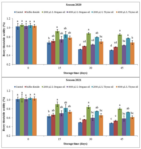 Effect of preharvest applications of oregano and thyme EOs on berry titratable acidity of ‘Flame Seedless’ grapes during cold storage at 1 °C. Each value represents the mean ± SE of three replicates. Means followed by the same letters in each season and storage period are not significantly different according to Tukey’s HSD test at p ≤ 0.05.