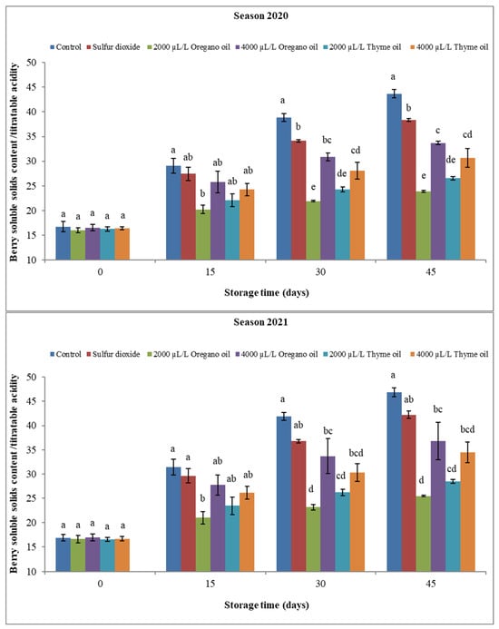 Effect of preharvest applications of oregano and thyme EOs on the berry soluble solids content/titratable acidity of ‘Flame Seedless’ grapes during cold storage at 1 °C. Each value represents the mean ± SE of three replicates. Means followed by the same letters in each season and storage period are not significantly different according to Tukey’s HSD test at p ≤ 0.05.