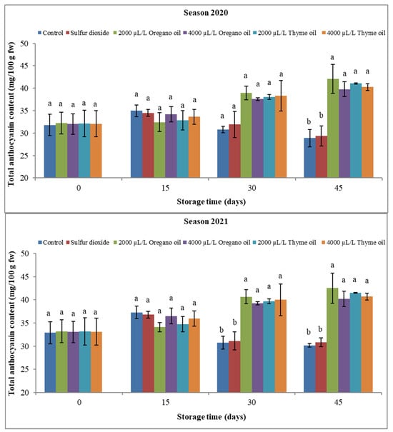Effect of preharvest applications of oregano and thyme EOs on total anthocyanin content of ‘Flame Seedless’ grapes during cold storage at 1 °C. Each value represents the mean ± SE of three replicates. Means followed by the same letters in each season and storage period are not significantly different according to Tukey’s HSD test at p ≤ 0.05.