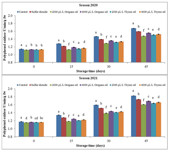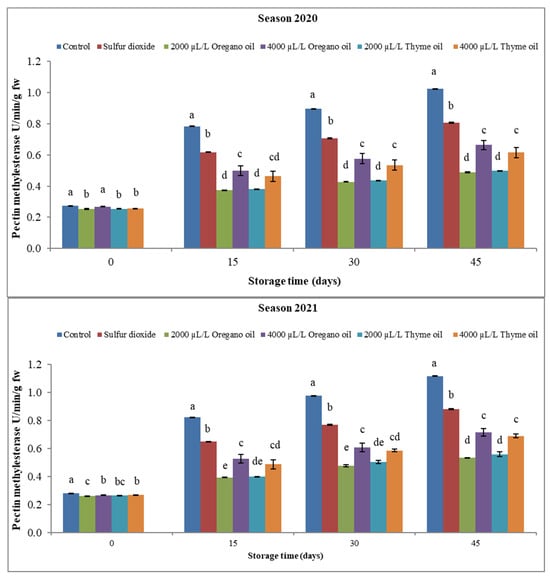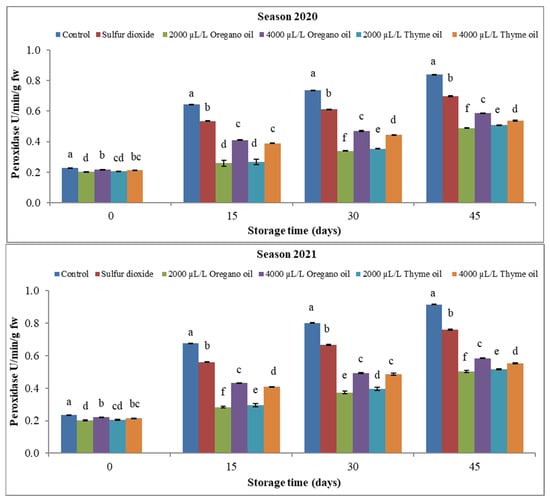 3.3. Effect of Preharvest Applications of Oregano and Thyme Essential Oils on Enzyme Activity of ‘Flame Seedless’ Grapes during 45 Days of Cold Storage