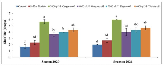 Fruit weight loss increased with the length of the storage period under all treatments (Figure 3). The lowest weight loss was found under preharvest treatment with oregano essential oil at 2000 µL/L in both seasons, while the highest weight loss was recorded in clusters sprayed with distilled water (control).