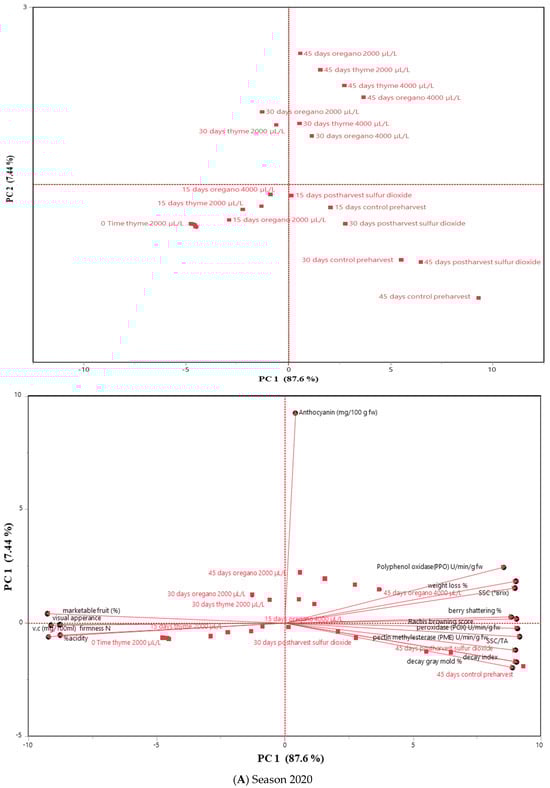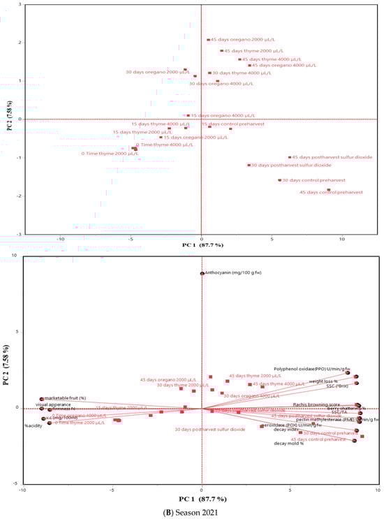 This experiment was arranged as a randomized complete block design with three replicates. Data were preliminarily tested for numerical normality and homogeneity of variance using the Shapiro–Wilk and Levene tests, respectively. Data calculated as percentages were first transformed to the Arcsine square root values before performing the analysis of variance (ANOVA), and results were presented as back-transformed means. The ANOVA was performed using the CoStat software package (version 6.311, CoHort software, Monterey, CA, USA). Mean comparisons were conducted, where appropriate, using Tukey’s honestly significant difference (HSD) test at probability (p) ≤ 0.05 []. The fruit characteristics were generated using a principal component analysis (PCA) []. The PCA was performed using JMP Pro 16 (SAS Institute, Cary, NC, USA). The SO2 treatment is not displayed in physio-biochemical attributes and enzyme activities because this treatment was started with the beginning of storage.