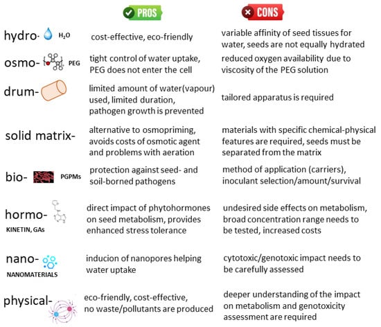 The process of seed priming requires the controlled imbibition of dry seeds in order to (i) allow the resumption of metabolic activities (the so-called ‘pre-germinative metabolism’), (ii) bring seeds into an advanced physiological stage and (iii) boost some key molecular events, namely the antioxidant and DNA repair responses. The latter contributes to preserve genome integrity, an essential requisite for successful germination []. The controlled seed imbibition, performed using only water or by adding a range of different priming agents, is then stopped before radicle protrusion occurs, otherwise the seed will lose desiccation tolerance. In this way, primed seeds will survive the subsequent dehydration or ‘dry-back’ that will bring them to standard moisture content for storage or to be sown in the field []. Seed priming-based methods include different types of treatments: hydropriming, osmopriming, drum priming, solid matrix priming, biopriming, hormonal priming, nanopriming, physical priming and hybrid priming. For each approach, a brief description is provided whereas the related advantages and limitations are listed in Figure 1.