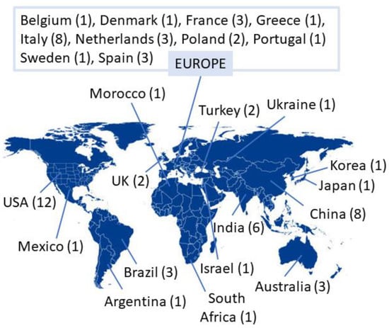 Global distribution of breeder/producers of onion seeds. For each country, the number of companies involved in onion breeding and seed production is shown in brackets. Data retrieved from SeedQuest®. (https://www.seedquest.com/seed/vegetables/onion/index.htm, accessed on 19 December 2022).