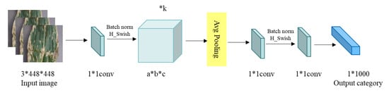 Mobilenetv3 [33,47] obtained parameters by NAS (network architecture search) search. It has two versions, large and small, suitable for different scenarios. It inherits the depthwise separable convolution of Mobilenetv1 and the residual structure with the linear bottleneck of Mobilenetv2. Mobilenetv3 uses the NetAdapt algorithm to obtain the optimal number of convolution kernels and channels. It introduces the SE channel attention structure based on MobileNetV2 and modifies the MobileNetV2 back-end output. Mobilenetv3 uses a new activation function, h-swish (x), instead of Relu6. It uses Relu6 (x + 3)/6 to simulate sigmoid in the SE module. Figure 3 shows the network model structure of Mobilenetv3, divided into three parts: The first part consists of 1 convolutional layer, extracting features by 3 × 3 convolution; the second part has multiple convolutional layers; due to different levels and parameters, divided into large and small version, the number of small is 13 and large is 15; the third part is to reduce parameters and calculation, it advances the Avg Pooling, replacing the entire connection with two 1 × 1 convolutional layers, and finally outputting the category.
