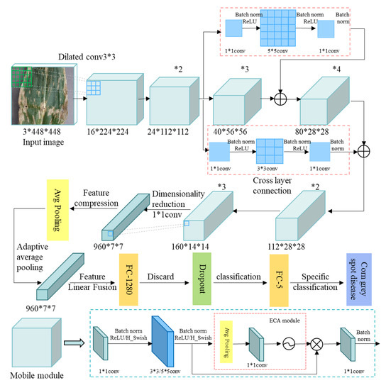 Corn is the most productive grain crop in the world and one of the major grain crops in China. China’s corn industry is developing rapidly; the sown area reached 41.26 million hm2 in 2020, creating a high yield record of 24,948.75 kg/hm2 [1]. Various leaf diseases occur in corn during planting, affecting corn’s yield and quality. Therefore, it is essential to efficiently and accurately identify corn leaf diseases. Solve the following problems intense subjectivity and low efficiency in traditional manual identification of diseases. Some researchers, such as Dang [2], Xiong [3], Su [4], Yuan [5], etc., used image processing technology based on machine learning to diagnose and identify types of crop diseases. Traditional machine learning [6,7,8,9,10] requires manual extraction of disease features, and it is not only time-consuming and labor-intensive but also a low generalization. The emergence of deep learning (DL) [11,12,13,14,15] provides a new method for plant disease identification. DL is also used in many fields [16,17,18,19,20]. Convolutional neural network(CNN) [21,22,23,24,25] is one of the most common DL methods. In image classification, due to the large amount of data to be processed, it isn’t easy to keep the original features of images in digitization. CNN has the ability of representation learning, which can automatically extract features from images of different scales. CNN has a strong ability to extract image features and high accuracy. It has been widely used in agriculture in recent years. For example, In 2020, Xu et al. [26] proposed a CNN model based on the VGG-16 model to realize the image recognition of corn diseases under the complex field background of small data samples. This model uses transfer learning to recognize corn disease images, which can improve the model’s convergence speed and recognition ability. The accuracy is 95.33%. Ren et al. [27] constructed a VGG network model based on deconvolution guidance for plant leaf disease identification and disease spot segmentation. Anagnostis et al. [28] used a self-built walnut leaf dataset, they proposed a CNN-based method for identifying anthracnose in walnut leaves, and the accuracy ranges from 92.4% to 98.7%. Maeda-Gutiérrez et al. [29] used models such as AlexNet, GoogleNet, and InceptionV3 to identify nine different types of tomato diseases, and the accuracy is 99.72%. In 2021, Bao et al. [30] proposed an improved CNN model to identify corn leaf diseases, it improved the model’s stability, and the accuracy was 95.74%. Hassan et al. [31] proposed two methods, shallow VGG with RF and shallow VGG with Xgboost, to identify diseases, and the experiments achieved good results on corn, potato, and tomato. In 2022, Wang et al. [32] proposed a corn disease identification model (AT-AlexNet) based on AlexNet, constructed a new downsampling attention module, and introduced the Mish activation function, and the average accuracy was 99.35%. The above studies have achieved good results, but the model parameters are large, and the running time is long. These are unsuitable for mobile terminal development and not convenient for farmers. It isn’t easy to expand other applications.