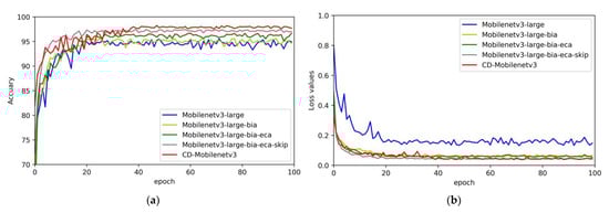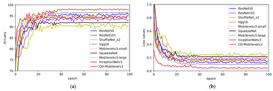 Figure 6 shows the convergence of the accuracy and loss values of the network models compared to the test set within 100 epochs. Figure 6a shows that adding other DL models’ accuracy gradually slowed down around 20 epochs with the increase in the number of iterations. It began to converge around 40 epochs, and the accuracy of the overall network model was not high. After 20 epochs of training, the accuracy of the CD-Mobilenetv3 model still improved gradually under the training of data samples. The CD-Mobilenetv3 model began to converge after about 40 epochs of training, and the training accuracy of the network approached 98.23%. Figure 6b shows that with the increase in iteration times, the loss value of other comparable models decreased slowly. The loss value of the CD-Mobilenetv3 model dropped fastest and reached a stable point in 40 epochs. The loss value of the network approached 0.0285. From the perspective of the convergence of the loss value, the training effect of the CD-Mobilenetv3 model was ideal.