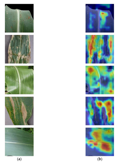 It can be seen more intuitively from Figure 7, where the corn leaf disease was deep and bright, and features with different colors showed the attention of different regions. The redder the color, the higher the attention of the area. It showed that when introduced the attention mechanism, the CD-Mobilenetv3 model paid more attention to the regions with more apparent features in the process of classification and identification in feature extraction and representation. It reduced problems such as background area interference in the disease identification process to improve the network model’s performance.