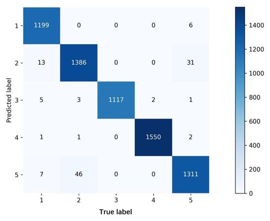 Analyzing the confusion matrix of recognition results presented in Figure 8 showed that by using the CD-Mobilenetv3 model, from the error between actual and predicted labels, labels 2 and 5 have a high misclassification rate. Label 1 was mistakenly divided into label 2 with thirteen images, label 1 was mistakenly divided into label 3 with five images, label 1 was mistakenly divided into label 4 with one image, and label 1 was mistakenly divided into label 5 with seven images. Label 2 was mistakenly divided into label 3 with three images, label 2 was mistakenly divided into label 4 with 1 image, and label 2 was mistakenly divided into label 5 with forty-six images. Label 3 has no mismarking. Label 4 was mistakenly divided into label 3, with two images total. Label 5 was mistakenly divided into label 1 with six images. Label 5 was mistakenly divided into label 2 with thirty-one images, label 5 was mistakenly divided into label 3 with one image, and label 5 was mistakenly divided into label 4 with two images. These results further verified the effectiveness of the attention mechanism in improving model recognition performance. Further analysis of the results showed that the disease features of the misclassified images were very similar, so the accurate recognition of image features has a certain influence on the accurate recognition of disease.