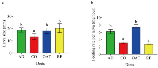 Effect of diet regimes on the performance of C. suppressalis larvae. (a) Larval size on each diet. (b) Feeding rate of larvae on each diet. AD: artificial diet, CO: corn diet, RE: rice diet, OAT: water oat diet, LAAD: larvae fed on an artificial diet, LACO: larvae fed on a corn diet, LARE: larvae fed on a rice diet, and LAOAT: larvae fed on a water oat diet. Different letters indicate significant differences across the treatments, p < 0.05.