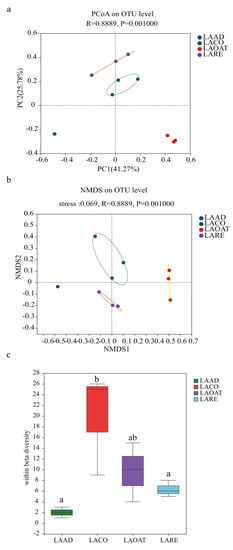 Beta diversity and within beta diversity analyses of C. suppressalis larvae on different diets. (a) PCoA (principal coordinates analysis) based on the Bray−Curtis distance at OTU level. (b) NMDS (non-metric multidimensional scaling) diagrams based on the Bray−Curtis matrix at OTU level. (c) At each diet, variations of within beta diversity (sample dispersion) were measured as the distance of each sample from the centroid of each diet group. Distance was calculated using the OTU level of each sample group based on Bray−Curtis. The distribution of within beta diversity for each diet was visualized using boxplots (reported data: minimum, first quartile, median, third quartile, and maximum). LAAD: larvae fed on an artificial diet, LACO: larvae fed on a corn diet, LARE: larvae fed on a rice diet, and LAOAT: larvae fed on a water oat diet. Different letters indicate significant differences across the treatments, p < 0.05.