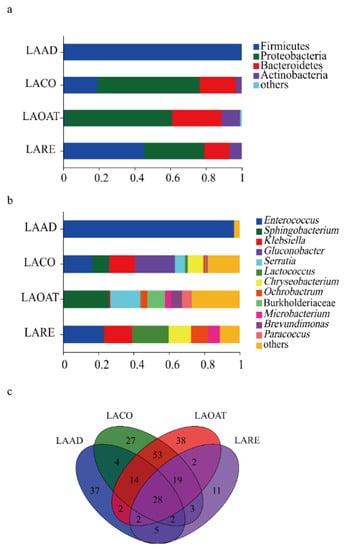 The taxonomic analysis at the phylum level revealed that Firmicutes was dominant in LAAD (99.41%) and LARE (45.36%) (Figure 3a). The other two groups were dominated by phyla Proteobacteria and Bacteridetes (Figure 3a). The relative abundance of Actinobacteria (10.38%) in LAOAT was higher compared to the other groups. Furthermore, the analysis was conducted at the genus level for the 16s database, revealing the presence of bacteria associated with each diet regime (Figure 3b). The feeding larvae of each diet regime showed greatly different bacterial communities. LAAD was dominated by Enterococcus (96.62%). The dominant genus was Gluconobacter (22.56%) in LACO, followed by Enterococcus (16.38%) and Klebsiella (14.64%). LAOAT contained a greater abundance of Sphingobacterium (25.40%) and Serratia (16.85%). The dominant genera in LARE were Enterococcus (22.44%), Lactococcus (20.46%), and Klebsiella (15.81%). A total of 28 genera were shared among all the gut samples, which mainly belonged to the phyla Proteobacteria, Acidobacteria, Firmicutes, and Bacteroidetes (Figure 3c). LAAD and LARE shared 5 genera, whereas LACO and LAOAT shared 53 genera. LARE had 11 unique genera and the other three larvae had over 27 specific genera (Figure 3c).
