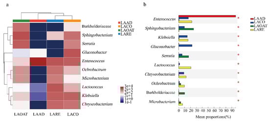 Heatmaps of the top ten abundant genera in C. suppresallis fed with different diets are shown in Figure 4a. Genera including Lactococcus, Klebsiella, Chryseobacterium, Ochrobactrum, and Microbacterium were significantly more abundant in LARE (Figure 4b; Kruskal–Wallis H test, p < 0.05). In LACO, Gluconobacter, Enterococcus, Klebsiella, Chryseobacterium, Sphingobacterium, and Serratia had high abundance. The proportion of the genera Sphingobacterium and Serratia were significantly higher in LAOAT compared with the other three groups (Figure 4b; Kruskal–Wallis H test, p < 0.05). Gluconobacter, Burkholderiaceae, and Lactococcus were significantly more abundant in LACO, LAOAT, and LARE compared to LAAD, respectively (Figure 4b; Kruskal–Wallis H test, p < 0.05).
