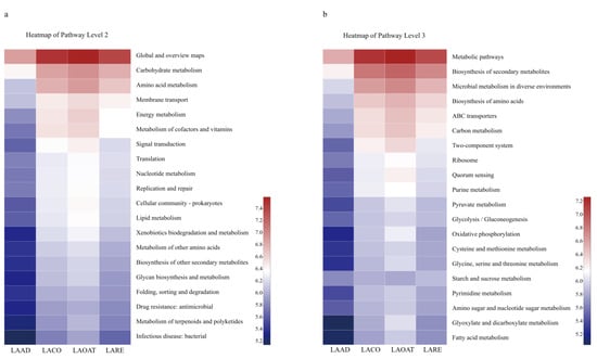 The abundances of KEGG pathways were predicted using PICRUSt based on 16S rRNA gene sequences. We displayed the pathway abundances at two levels using heatmaps (pathway level two and pathway level three) (Figure 5). In pathway level two, carbohydrate metabolism, amino acid metabolism, and membrane transport were enriched in all the groups except LAAD (Figure 5a). At pathway level three, metabolic pathways, the biosynthesis of secondary metabolites, the microbial metabolism in diverse environments, and ABC transporters were enriched in LACO, LAOAT, and LARE (Figure 5b).