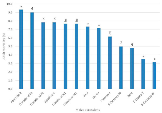 Adult mortality before entering the seed of thirteen maize accessions. Lsmeans followed by the same letter were not significantly different (p < 0.05).