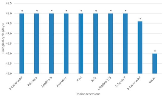 Biological cycle for thirteen maize accessions. Lsmeans followed by the same letter are not significantly different (p < 0.05).