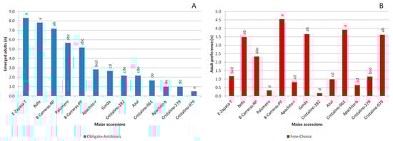 First-generation adults emerged from thirteen maize accessions in the obligate-antibiosis bioassays (A) and adult preference (B) in the free-choice experiment. Lsmeans followed by the same letter within each experiment are not significantly different (p < 0.05).