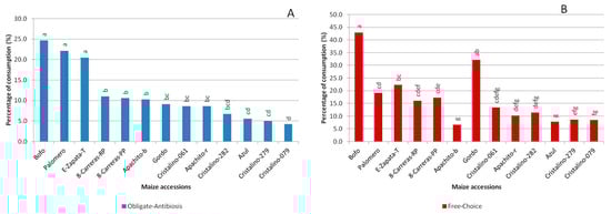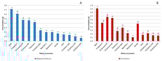 Net consumption (g) by S. zeamais on kernels from thirteen maize accessions in the obligate-antibiosis (A) and free-choice (B) experiments. Lsmeans followed by the same letter within each experiment were not significantly different (p < 0.05).