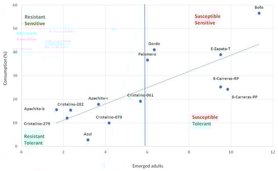 As a summary, grain yield losses (measured as the percentage of consumption) were represented against S. zeamais antibiosis and/or antixenosis (measured as the number of emerged adults of the first and second generations). The line of regression for the percentage of consumption (dependent variable) on emerged adults (independent variable) divided the accessions into tolerant, when they had lower yield losses than expected based on the value of the independent variable, and sensitive, when the losses exceed the values marked by the line of regression. In addition, a vertical line drawn on the average of emerged adults divided the accessions into resistant, when the number of emerged adults was fewer than the average of all varieties, and susceptible, when they exceed the average (Figure 7).