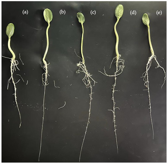 Cucumber seedlings at 7 days old, whose seeds were inoculated with plant-growth-promoting rhizobacteria: (a) control without any rhizobacteria inoculation, (b) Bacillus cereus (KBEndo4P6), (c) Acinetobacter radioresistens (KBEndo3P1), (d) Pseudomonas paralactis (KBEndo6P7), and (e) Sinorhizobium meliloti (KBEkto9P6).