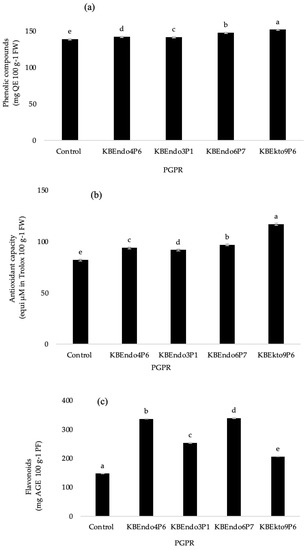 Effect of PGPR on the synthesis of phytochemical compounds. (a) Total phenolic compounds; (b) antioxidant capacity; and (c) flavonoids. Data are shown as the mean ± standard deviation (SD, n = 50). The average values in the columns with different letters differ statistically from each other (Tukey’s test p ≤ 0.05).