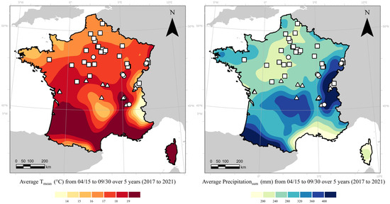 Geographical repartition of the Multi-Environmental Trial (MET) under French climatic conditions. The MET is constituted of 112 environments (a result of the unbalanced combination of 60 locations and five years). Both maps indicate the trials’ positioning over the five years (2017 to 2021) by tested maturity: MG000 (□), MG00 (Δ) and both (○). The maps show a colour gradient of mean temperature (left) and cumulative precipitation (right) over the five years, calculated on the average growing period from 15 April to 30 September (data source: Joint Research Centre meteorological data).