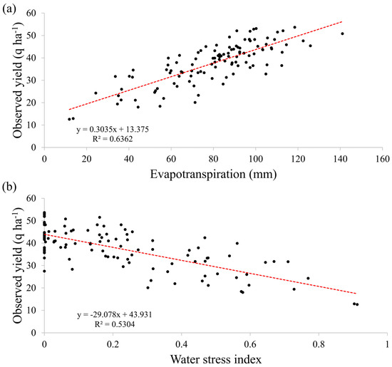Relationship between observed soybean grain yield and the two first contributing eco-climatic factors from End of Pod to Physiological Maturity. (a) Sum of evapotranspiration. (b) Water stress index (0 = no stress, 1 = high stress). Water stress index and sum of evapotranspiration were simulated daily by the CROPGRO-soybean model.