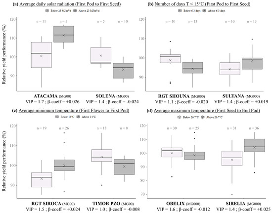 Relative yield performance of cultivars with contrasted response to different levels of selected eco-climatic factors frequently involved in GEI. (a) Relative yield of cv. ‘ATACAMA’ and cv. ‘SOLENA’ by average daily solar radiation during First Pod to First Seed (FPFS) phenophase. (b) Relative yield of cv. ‘RGT SHOUNA’ and cv. ‘SULTANA’ by number of days with a minimum temperature below 15 °C during First Pod to First Seed (FPFS) phenophase. (c) Relative yield of cv. ‘RGT SIROCA’ and cv. ‘TIMOR PZO’ by average minimum temperature during First Flower to First Pod (FFFP) phenophase. (d) Relative yield of cv. ‘OBELIX’ and cv. ‘SIRELIA’ by average maximum temperature during First Seed to End Pod phenophase. Cultivar relative yields were calculated as the ratio of cultivar yield on the performance checks average yield present in all trial/year combinations. Only analyses showing a VIP greater than 1 for the selected eco-climatic factors were retained. Average VIP and β-coefficient are given for each cultivar. The numeric value “n” above each box corresponds to the number of environments included in each box plot. Each box displays the median, upper and lower quartiles of the respective distribution. Box whiskers represent the maximum and minimum range excluding any extreme outliers (shown as dots).