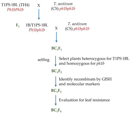 The F1 hybrid progeny from the cross between the homozygous 1PS·1BL translocation line (TH4) and CS ph1b mutant were backcrossed to the ph1b mutant to establish individuals heterozygous for chromosome arms 1PS and 1BS in a ph1bph1b genetic background (Figure 1). The F1 hybrid progenies were genotyped by PCR using two 1PS specific markers to ensure that they retained chromosome arm 1PS (Supplementary Figure S1). A total of 71 BC1F1 plants were established, and of them, 35 (49.3%) contained the 1PS·1BL translocation.