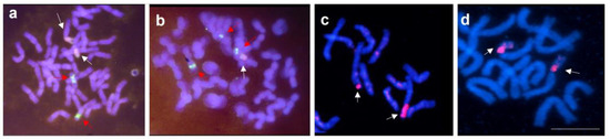The FISH/GISH on mitotic metaphase chromosome spreads in BC1F2 plants of (a) homozygous T1PS·1BL translocation line; (b) heterozygous T1PS·1BL translocations line; (c) heterozygous recombinant type 1; (d) homozygous recombinant type 2. In (a,b), double hybridization signals using both genomic A. cristatum DNA (red, white arrows) and pTa71 probe (green, red arrows) are shown; in (c,d), genomic A. cristatum DNA (red) is shown. Bar = 10 µm.