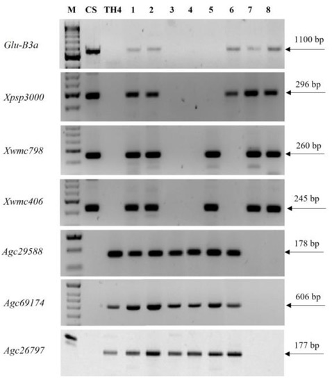 PCR amplification profiles of 1BS-specific markers (GluB3a, Xpsp3000, Xwmc798 and Xwmc406) and 1PS-specific markers (Agc29588, Agc69174 and Agc26797) on BC1F2 plants. Lanes M: marker; CS: ’Chinese Spring’; TH4: T1PS·1BL translocation line; 1–2: heterozygous plants for 1PS·1BL translocation; 3–4: homozygous plants for 1PS·1BL translocation; 5: 1BS/1PS recombinant type 1; 6: 1PS/1BS recombinant type 2; 7–8: wheat plants with no introgression from A. cristatum. Arrows indicate the diagnostic amplification product.