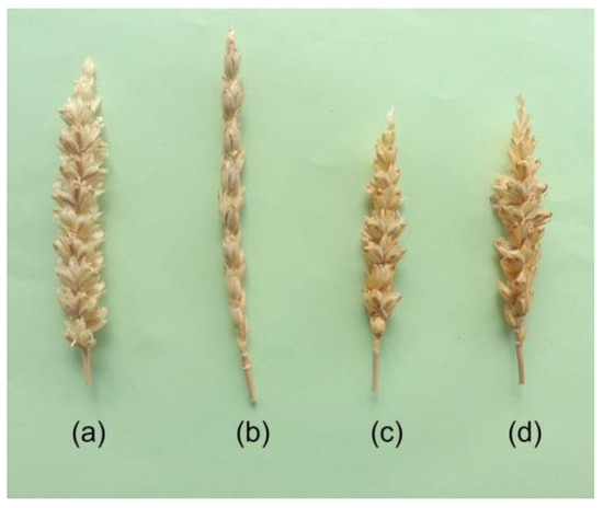 By GISH and PCR analyses of the derived BC1F3 and BC1F4 plants, homozygous translocation lines for the 1PS proximal translocation carrying both the Glu-B3a and Gli-B1 loci were confirmed. Nonetheless, no homozygous plants were recovered for the recombinant type 1 in the BC1F3 and BC1F4 progenies. All lines obtained were fertile and vigorous. The spike morphology of BC1F4 plants carrying homozygous translocations from A. cristatum is shown in Figure 4.