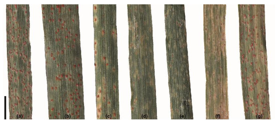 Infection type (IT) observed in the studied lines: Califa Sur ((a), IT 9); CS ((b), IT 9); TH4 ((c), IT 6(9)); BC1F4-15-10-2 ((d), IT 2(6)); BC1F4-37-2-21 ((e), IT 2(6)); BC1F4-43-2-4 ((f), IT 5(6)); and BC1F4-45-2-7 ((g), IT 9). IT values in parenthesis correspond to the secondary IT observed at a low frequency. Scale, 0.5 cm.