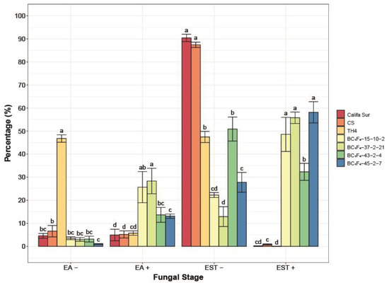 The highest percentages of EST not associated with host cell necrosis (EST−, Figure 7A), were found in the susceptible control Califa Sur (90.43%) and CS (87.42%). This parameter was also significantly higher in both the BC1F4-43-2-4 (50.88%) and TH4 (47.47%) lines than in the other lines. Finally, the percentages of EST colonies associated with necrotic plant cells (EST+, Figure 7B) were significantly higher in the BC1F4-45-2-7 (58.15%), BC1F4-37-2-21 (55.78%) and BC1F4-15-10-2 (48.56%) lines, followed by the BC1F4-43-2-4 (32.30%) line. None or very few (from 0.0% to 0.83%) of the EST colonies in the CS wheat, TH4 line and the control Califa Sur were associated with necrotic cells.