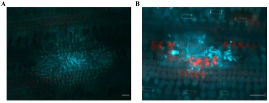 Microscopically observed established colonies (EST) of P. triticina showing the absence (A) or presence (B) of necrotic (autofluorescence) plant cells. Scale, 50 µm.