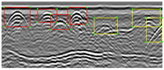 The dataset used for the deep learning network model training was divided into real measurement images and simulation images. Among 2069 total images, there were 997 real images and 1071 simulated ones. According to the ratio of 4:1, the dataset was divided into the training set and testing set. The data set was manually labeled using LabelImg software, with the labeling method shown in Figure 3. For the hyperbola framing, the hyperbola’s vertices were placed in the middle of the rectangular box to enclose the whole hyperbola as much as possible, and a label file was generated corresponding to the image after the hyperbola framing is completed. The red area indicates the framed hyperbola that needs to be labeled, while the yellow area indicates that the label was not generated because the hyperbola was blurred or there was only a small part of the hyperbola waveform.