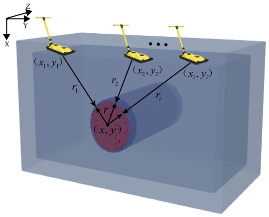 The number of equations in Equation (7) is greater than the number of unknowns and can be calculated iteratively using the Levenberg–Marquardt algorithm to solve for the , , optimal solutions, i.e., the central location of the roots as well as the root diameter [24].