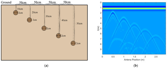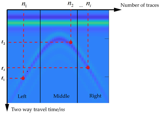 B-scan consists of several A-scan traces. In the Equation (5), refers to the trace spacing in the unit of m, , , … indicates the number of acquisition traces that is also the serial number of A-scan, … indicates the two-way travel time of electromagnetic waves in the unit of ns, and is the propagation speed of electromagnetic waves in the soil medium in the unit of m/s. The calculation formula is