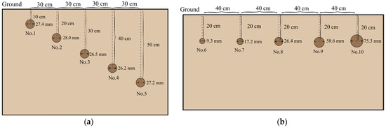 In order to verify the feasibility of applying the method proposed in this paper in actual detection, the PulseEKKO PRO ground-penetrating radar produced by the Canadian Sensor&Software Company was used in the soil trough laboratory of the Engineering College of South China Agricultural University to conduct a pre-burial test under controlled conditions. The size of the soil tank was 8 2 1.5 . The soil type of dry sandy loam has evenly distributed and stable physical properties that can be simulated easily to avoid the formation of clumps and voids by the reflection images of the ground-penetrating radar. According to the results of the simulation test, it can be found that when the antenna frequency was 1000 MHz, the results of positioning and root diameter estimation were more accurate than those by using antennas with two other different frequencies. Therefore, the antenna frequency of GPR was chosen to be 1000 MHz in the root pre-burial test. Fresh branches with relative dielectric constants close to those of the roots were selected as the test materials. There are two kinds of experiments under different experimental conditions. The first one targets the tree roots with same diameter buried at different underground depths, as shown in Figure 7a. Five branches with close diameters, numbered 1 to 5, were selected for the experiment, whose diameters ranged from 26 to 28 mm. They had a spacing of about 30 cm between their adjacent branches. They were buried underground at a depth ranging from 10 to 50 cm with each buried with a depth difference of about 10 cm. The second kind of experiment targets the tree roots with different diameters buried at the same underground depth, as shown in Figure 7b. Five branches of different diameters, numbered 6 to 10, were selected for the experiment. Their diameters ranged from 0.5 to 8 cm, and the spacing between their adjacent branches was 50 cm. They were buried at an underground depth of 20 cm. Before the detection of roots starts, it is necessary to measure the propagation velocity of electromagnetic waves in the soil. Since the physical properties of the soil in the soil tank remain stable and evenly distributed, the velocity of electromagnetic waves can be calculated according to the propagation theory of electromagnetic waves when the depth of the target object is known [26], The formula is shown in Equation (8).