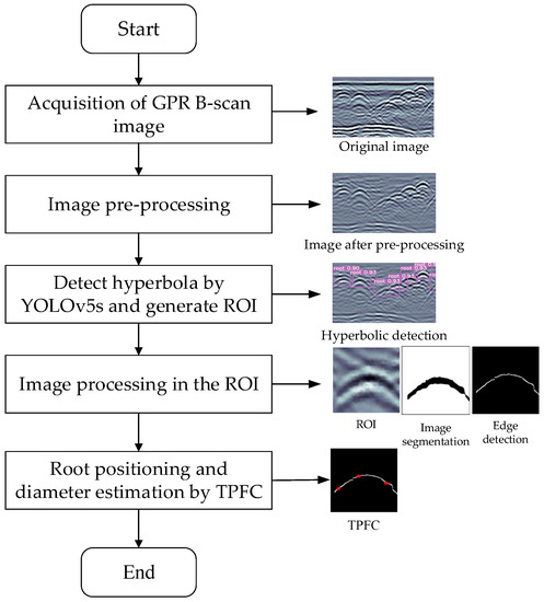 This paper proposes a method based on YOLOv5s and ground-penetrating radar technology to realize the fast and accurate detection of hyperbolas in B-scan images, with the TPFC method applied to accurately locate and estimate root diameters. This study quickly and accurately detected root systems and performed localization and root diameter estimation, providing some ideas for nondestructive root detection and three-dimensional reconstruction of root systems. However, there are some problems and inadequacies that need to be solved in future work. First, due to the complex soil environment, complexity of field tests and the inability to distinguish whether the collected data are those of roots or other foreign objects, further research is needed to investigate the differences in hyperbolic characteristics between roots and non-root targets. Secondly, further research is needed on the removal of clutter and methods to enhance the hyperbolic signal.