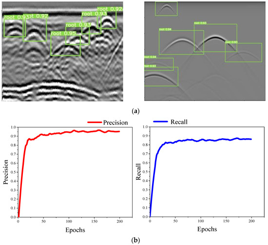 The detection results by this model on the validation set are shown in Figure 11a, where all the root target hyperbolas can be framed with a confidence level of 0.92 or even higher. Figure 11b shows the variation of the accuracy and recall rate of using the model in 200 epochs, with the accuracy rate reaching 96.7% and the recall rate 86.6%. It is obvious that the accuracy rate is rather satisfactory, while there is still some room for improvement in the recall rate. The average detection time per image was 13 ms, which is much less than the time required for manual detection. All these results show that the YOLOv5s model can be used to detect the hyperbola of objects in B-scan images quickly and accurately.
