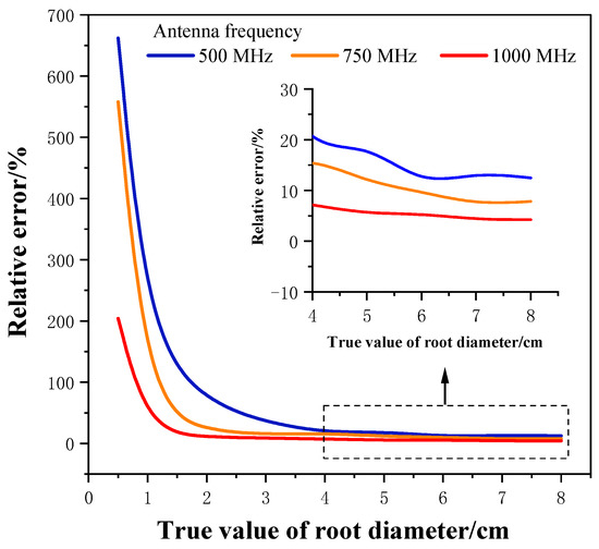For root diameters greater than 1 cm, the estimates were very close to the actual values, with the slopes of the fits being 1.392, 1.042, and 1.029, and s being 0.902, 0.880, and 0.987. It can be seen that the root diameter estimation result was closest to the real value at the antenna frequency of 1000 MHz. The relative errors of the estimation results are compared in Figure 15. Under these three circumstances, the maximum value of the relative error was obtained at the minimum value of the root diameter, and the relative error gradually decreased with the increase in the root diameter. The relative error of root diameter estimation by using the 1000 MHz radar antenna was smaller than that using other two antennas, which was kept within 10% for root diameters greater than 2 cm. These results demonstrate the feasibility of estimating the root diameter of trees using the TPFC method.
