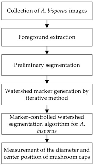 The flow of the A. bisporus segmentation and recognition algorithm is shown in Figure 1. First, the image background was filtered using histogram equalization [24,25], Otsu threshold segmentation [26], and morphological operations [27,28] to extract foreground images containing only A. bisporus. Then, individual mushroom markers were prepared by preliminary segmentation as well as by the iterative marker generation method based on distance transformation, global threshold segmentation, and area filtering. The A. bisporus was subsequently segmented using a marker-controlled watershed algorithm. Finally, the bounding rectangle method was adopted to calculate mushroom cap diameter and center position to identify and locate A. bisporus. All algorithms were implemented based on OpenCV (Open Source Computer Vision) libraries, which include a wide catalog of highly optimized computer vision algorithms.