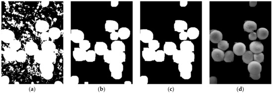 As shown in Figure 2, the domains corresponding to mature A. bisporus after binarization are large white blocks, and scattered mycelia and immature mushrooms form many small noises, burrs, and fine connections in the matrix background. The binary image was processed using the morphological opening operation according to the image features. After comparing several trials, a structural element with a rectangular shape and 7 × 7 size was finally used for multiple open operations, considering the real-time demand of image recognition. The ratio of pixel size of the structural element to pixel size of the image is 1.81%. The results are shown in Figure 4b. As shown in the figure, the mycelia and small immature mushrooms in the background have been filtered out, but not the mushrooms at the edges of the image that were not fully captured due to the limitation of camera views (collection completeness was less than 50%). There can be a significant error in positioning and measuring the diameter of these mushroom caps. Therefore, the area of all contours in Figure 4b was calculated using the contourArea function [29], and the contours of small areas corresponding to incomplete mushrooms were filtered out, thereby obtaining Figure 4c with the background completely filtered. The original image was processed with the “and” operation to obtain the foreground image of A. bisporus.