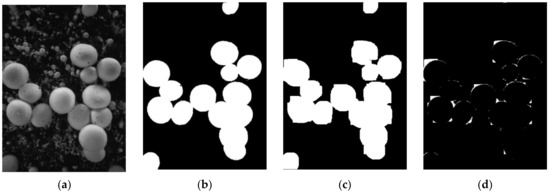 To verify the foreground extraction effect of the proposed algorithm, we manually separated the A. bisporus region in the image using Photoshop software, and the separation result was used as the standard image. The error between the extraction results using the proposed algorithm and the standard image was calculated, as shown in Figure 5. Here, Figure 5a is the grayscale image of A. bisporus; Figure 5b shows the manual extraction result; Figure 5c indicates the result of the foreground extraction algorithm presented in this paper; Figure 5d, the error binary image, shows the difference between Figure 5b,c, representing the background parts misused as foreground.