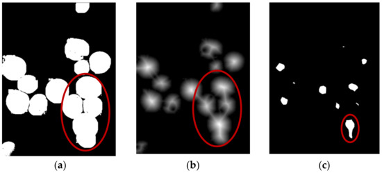 Effects of watershed markers prepared by distance transformation and global threshold segmentation after preliminary segmentation. (a) Foreground binary image; (b) Distance transformation after preliminary segmentation; (c) Segmentation results of high thresholds.