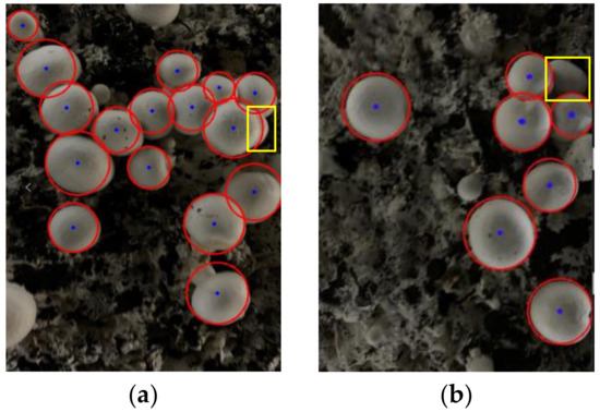 Table 2 shows that the average miss rate of the algorithm was 4.3%, and the false rate was 0.89%. There are two causes for missed detections: One is that the height of individual A. bisporus can vary significantly at the adhesion points, and the lower individual A. bisporus can be almost completely obscured, as shown in Figure 15a. The other is that uneven light can lead to low grayscale values for some A. bisporus, which are mistaken for the background and missed, as shown in Figure 15b. The main reason for false detection is that the shape and grayscale value of some mycelium areas are close to the performance of A. bisporus, so they are mistaken as individual A. bisporus. The probability of false detection is extremely low due to the excellent effect of the algorithm in extracting the foreground.