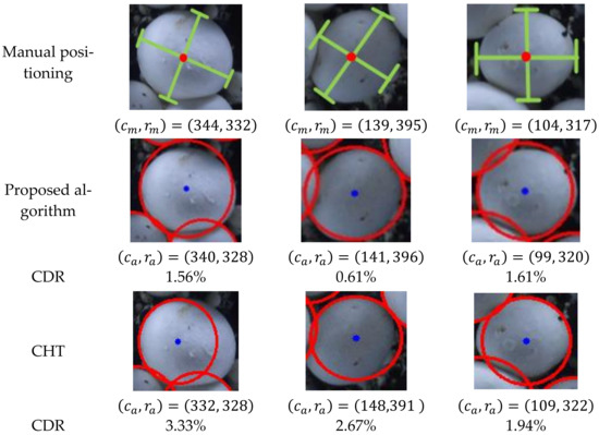 where and represent the column and row coordinates of the mushroom’s center point measured manually; and represent the column and row coordinates of the mushroom’s center point determined by algorithm; and and are the width and height of the image, respectively. The mushroom images in Figure 2 were utilized to verify the algorithm performance. Three examples of calculating the CDR are shown in Figure 16, and the calculation results of the proposed algorithm and CHT are illustrated in Table 6 and Table 7.